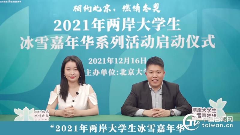 中国台湾网12月17日北京讯 在距2022北京冬奥委会开幕式倒计时50天的特别日子,“相约北京,燃情冬奥――2021年两岸大学生冰雪嘉年华”系列活动16日在北京大学成功启动。中共中央台办、国务院台办副主任龙明彪,北京市台办主任霍光峰,教育部港澳台办副主任舒刚波,北京市教委一级巡视员黄侃,北京大学副校长王博等领导出席线上启动仪式。清华大学、中国人民大学、北京师范大学、中国政法大学、北京中医药大学、北京体育大学及台湾大学、台湾师范大学、辅仁大学、彰化师范大学、景文科技大学、台湾海洋科技大学等两岸20所高校师生参加。