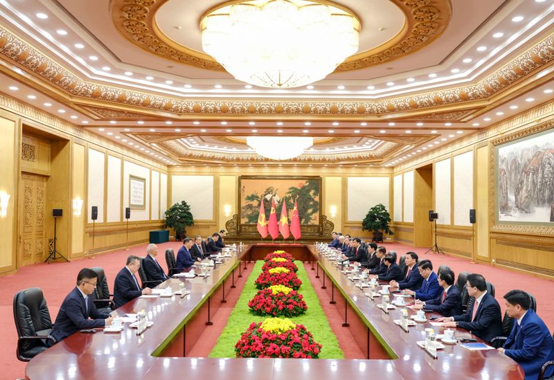 10月11日,中共中央总书记、国家主席习近平在北京人民大会堂会见越共中央政治局委员、中央书记处常务书记梁强。新华社记者 丁林 摄