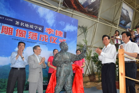 陈云林、汪明浩、田利跃与李本京一同在李捷首次发现中国长江以北基岩上第4纪冰川擦痕的地方,为李捷雕像揭幕。