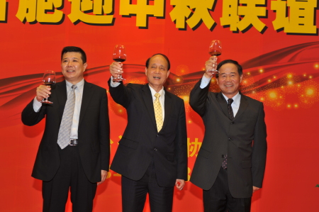 北京市台办主任汪明浩(左)、台湾海基会董事长林中森(中)和北京台资企业协会理事长林清发向京台两地嘉宾祝酒(孟福祥 摄)