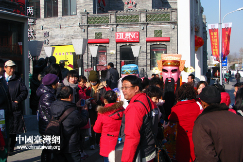 昨日下午,前门地区的台湾映像商务区举行盛大的“年货大街”开街仪式,电音三太子、鼓阵、舞狮、金光布袋戏等特色表演吸引了大批游客。据介绍,12月24日到明年2月8日期间,台湾美学生活馆全馆8折起,全区街店8折起,淘宝馆6折起,更有诸多的购物满赠活动。