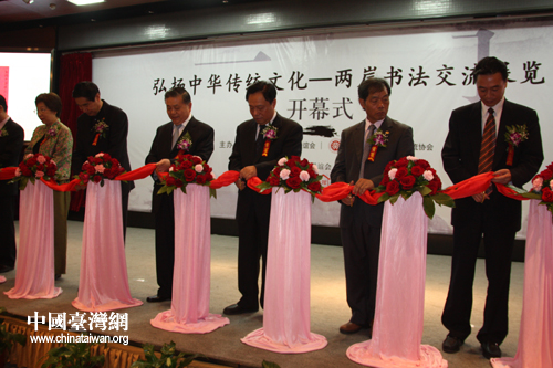 中国台湾网6月1日北京消息 “弘扬中华传统文化--两岸书法交流展览”于6月1日在北京台湾会馆开幕。本次活动为期5天,期间共展出两岸书法名家作品一百余幅,其中台湾作品68幅。海协会会长陈云林、国民党荣誉主席吴伯雄和海基会董事长江丙坤特地为本展览给予题词祝贺。海协会副会长王富卿出席并宣布展览开幕。
