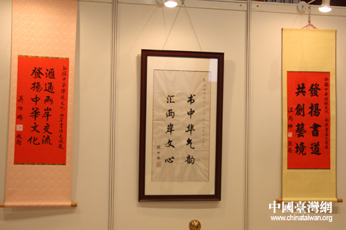 海协会会长陈云林、国民党荣誉主席吴伯雄和海基会董事长江丙坤特地为本展览给予题词祝贺。(中国台湾网 陈宁 摄)