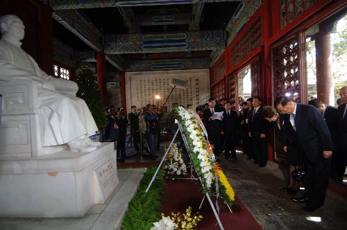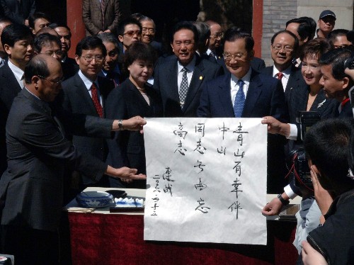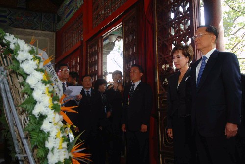 4月15日,中国国民党荣誉主席连战一行抵达北京香山碧云寺,参观孙中山纪念堂并拜谒孙中山先生衣冠冢。 新华社记者 王建华摄