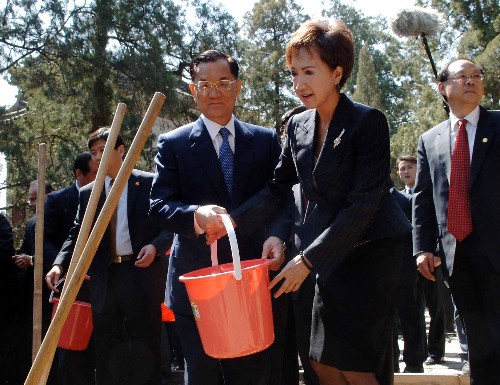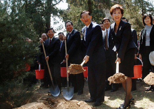 4月15日,中国国民党荣誉主席连战一行抵达北京香山碧云寺,参观孙中山纪念堂并拜谒孙中山先生衣冠冢。这是连战等在香山碧云寺植树。 新华社记者王建华摄