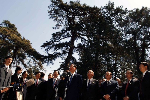 4月15日,中国国民党荣誉主席连战一行抵达北京香山碧云寺,参观孙中山纪念堂并拜谒孙中山先生衣冠冢。这是连战在香山碧云寺植树后发表讲话。 新华社记者 陈树根摄