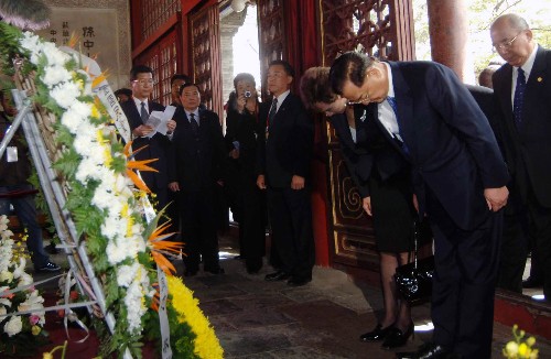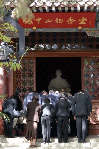 4月15日,中国国民党荣誉主席连战一行抵达北京香山碧云寺,参观孙中山纪念堂并拜谒孙中山先生衣冠冢。 新华社记者 陈树根摄