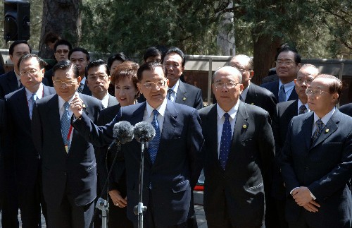 4月15日,中国国民党荣誉主席连战一行抵达北京香山碧云寺,参观孙中山纪念堂并拜谒孙中山先生衣冠冢。新华社记者 王建华摄