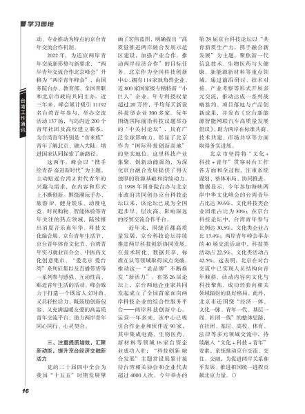 近年来,北京市深入贯彻习近平总书记关于对台工作的重要论述和新时代党解决台湾问题的总体方略,紧密围绕“四个中心”功能定位,以“文化+科技+青年”三位一体协同推进京台交流合作与融合发展,着力打造以重点品牌交流为引领、系列活动延伸助力的对台交流新格局,积极服务中央对台工作大局,为首都高质量发展贡献积极力量。