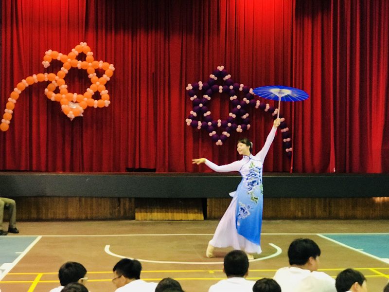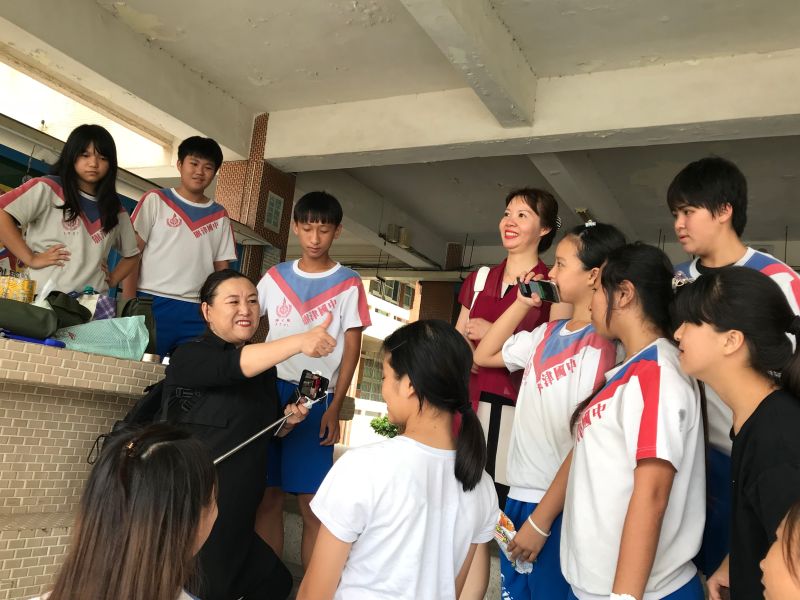交流团带来了即兴表演。非遗达人李学军表演了海淀非物质文化遗产——飞叉。工作人员黄宇玲则现场演绎了一段温婉似水的江南舞蹈《又见江南雨》。因为旗津中学的学生们大多祖籍都是江浙地区,这个舞蹈勾起了他们的思乡情,让他们仿佛回到了思念的家乡……书法达人佘汪洋现场挥毫泼墨,给同学们带来了福字团扇。