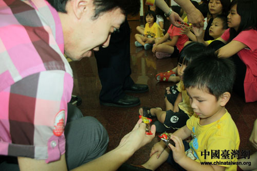 “糖葫芦很好吃,姐姐给你也吃。”修缘育幼院是嘉义目前唯一的育幼院,在这里生活着20余名小朋友,他们与一般家庭的孩子一样健康活泼,然而当一位小朋友紧紧地抱住北京市台办新闻处金秀清处长时,旁边一位小朋友扯了扯金秀清的衣角,轻声问道:“阿姨,你是他的妈妈吗?”让记者感觉到了这些小朋友心中那种难于言语的悲伤:无论怎么样的关怀都取代不了父母的爱。